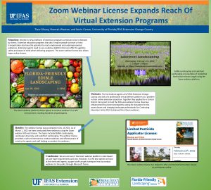 Methods: The horticulture agents at UF/IFAS Extension Orange County saw lack of a professional virtual delivery platform as a problem in their online extension education. Together they applied for a Central District mini-grant to fund the 500-seat webinar license. Revenue enhancement has been developed by asking for donations for the zoom classes and charging landscape professionals for Continuing Education Units (CEU’s) obtained from Zoom webinars.
