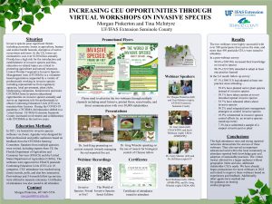 Situation: Invasive species pose significant threats including economic losses in agriculture, human and animal health hazards, disruption of native ecosystems and more. In the U.S., losses due to invasive species are estimated to cost over $120 billion annually. Florida has a high risk for the introduction and establishment of invasive species and thus, education on related topics are critical to protecting agriculture and natural resources. Central Florida Cooperative Invasive Species Management Area (CFCISMA) hosts in-person educational opportunities on invasive species annually, and since the COVID-19 pandemic, UF/IFAS Extension Seminole County has increased collaboration with CFCISMA on virtual education. Methods: In 2021, we hosted two invasive species webinars via Zoom. Webinar agendas were designed for both professional and public audiences. Speakers from multiple agencies were invited, including experts from UF, the Florida Department of Agriculture and Consumer Services (FDACS) and the United States Department of Agriculture (USDA). The webinars were approved for FDACS pesticide Continuing Education Units (CEUs) in 10 categories. Post-webinar and 3-6 month follow up surveys were utilized to measure outcomes. Results: The two webinars were highly successful with over 590 participants from across the state, and more than 450 pesticide CEUs were issued to attendees. In a post-webinar survey, 99.6% (528/530) increased their knowledge on invasive species and 98.3% (521/530) intended to adopt at least one practice learned (ie. reporting suspect pests, use caution to avoid spreading invasive species, employ integrated pest management, etc.). In the 3-6 month follow up survey, 97.1% (304/313) had adopted at least one practice since attending. Conclusion: The virtual webinars increased the capacity to teach larger audiences without geographic limits and offer CEUs to professional clientele. As a result of the webinars successes, CISMAs in other regions have reached out for guidance on hosting similar programs in collaboration with outside agencies.