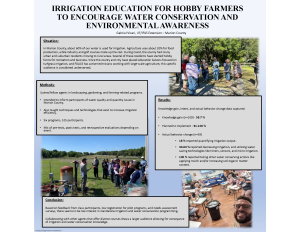 Situation: In Marion County, about 60% of our water is used for irrigation. Agriculture uses about 20% for food production, while industry and golf courses make up the rest. During Covid, the county had many urban and suburban residents moving to rural areas. Several of these residents have started hobby farms for recreation and business. Since the county and city have placed education liaisons focused on turfgrass irrigation, and FDACS has active technicians working with large-scale agriculture, this specific audience is considered underserved. Methods: I joined fellow agents in landscaping, gardening, and farming-related programs. My portion of the programs were delivered with the intention to inform participants of water quality and quantity issues in Marion County, as well as methods and technologies to increase irrigation efficiency. I joined six programs discussing these topics to fill this educational gap. Depending on the time constraint, either pre and post-tests or retrospective evaluations were administered to capture knowledge gained and intent to change behavior. Results: A total of n=105 participants indicated an average knowledge gain of 59.7 %. Those who reported that they planned to implement changes ranged from 91 to 100 %. Follow-up surveys were administered between 6 and 9 months later. Surveys suggested an 18% long-term behavior change was reported, such as quantifying irrigation output. 100% of survey respondents reported taking other actions, like applying mulch to reduce water loss and increase water holding capacity in soil (n=59). Based on feedback from class participants, low registration for pilot programs, and needs assessment surveys, there seems to be low interest in standalone irrigation and water conservation programming. Conclusion: Collaborating with other agents that offer diverse courses draws a larger audience allowing for conveyance of irrigation and water conservation knowledge.