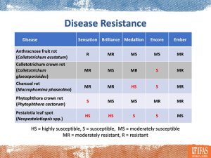 Dr. Peres’s research shows that Ember™ has the best overall disease resistance package, making it highly recommended for organic production. It is moderately susceptible to Pestalotia, unlike Brilliance™, which is highly susceptible. Encore™ also has good disease resistance but is slightly more susceptible to Colletotrichum gloeosporioides, which causes crown rots.