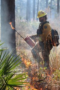 A man with a blowtorch helps conduct a prescribed burn in a Florida pine forest.
