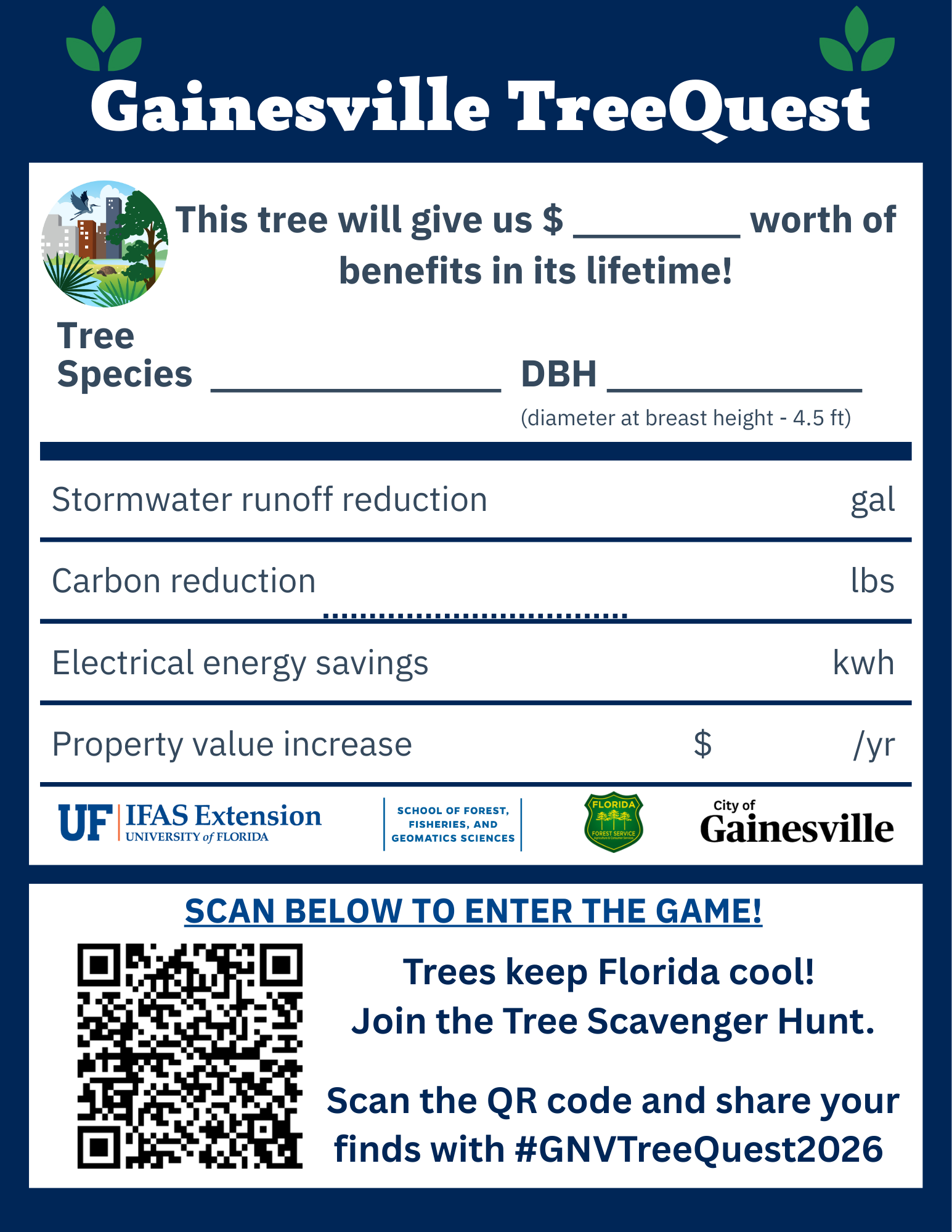 Visit any of the participating locations to find quest trees. We’ll tag each Quest tree with its details and a QR code. Scan the code to jump into the game. QR codes will take you to a short survey where you will answer questions about each tree location. You can also post a selfie with your quest tree by tagging #GNVTreeQuest2026. Each time you scan a new tree and fill in the survey, you will be entered into a drawing to win trees!