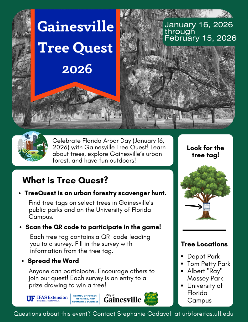 To celebrate Florida Arbor Day this year, we will launch Gainesville’s Tree Quest! The UF/IFAS School of Forest, Fisheries, and Geomatics Sciences and the City of Gainesville have partnered to build an urban forestry adventure that invites our community to get outside, learn about trees, and some of the benefits they provide in our city. The event will take place across three of Gainesville’s public parks and on the University of Florida campus.