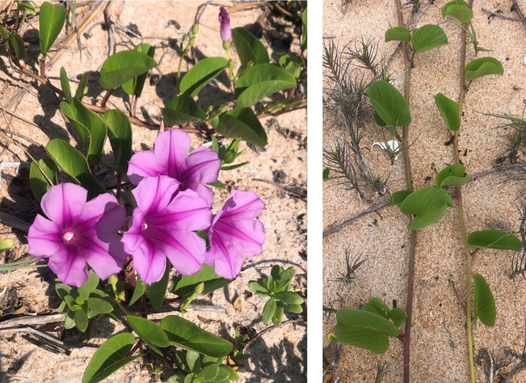 Railroad vine (Ipomea pes-capre) is a creeping vine that runs along the sand. Part of its scientific name “pes-capre” means goat hoof, named as such because the green leaves have two lobes and resemble their namesake! They have beautiful purple flowers. Railroad vine is a colonizing species that moves in after disturbances, such as storms, and helps with beach stabilization.