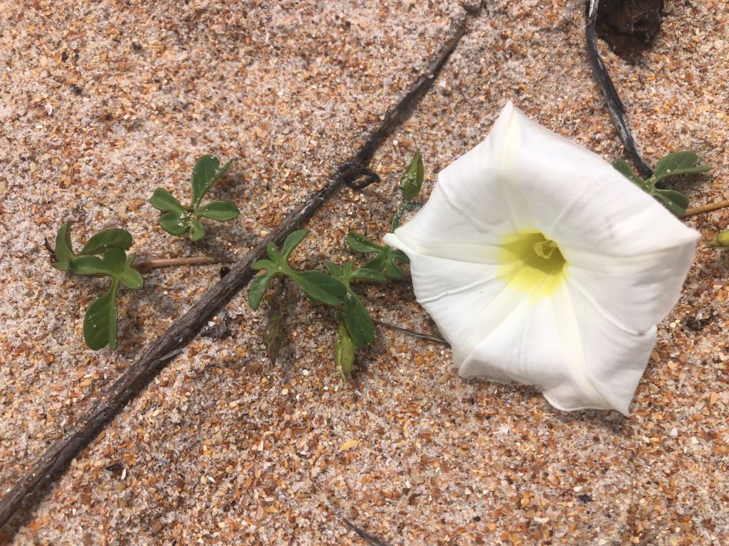 Beach morning glory (Ipomoea imperati) is related to the railroad vine and looks similar. However, the leaves are smaller, and they have white flowers. The name comes from the fact that (like the railroad vine), their flower only blooms for one day – so enjoy the morning glory of the blossom! Also like the railroad vine, the morning glory creates a groundcover and helps stabilize sand on the beach. Note that there is some variation in the shape of the leaves.