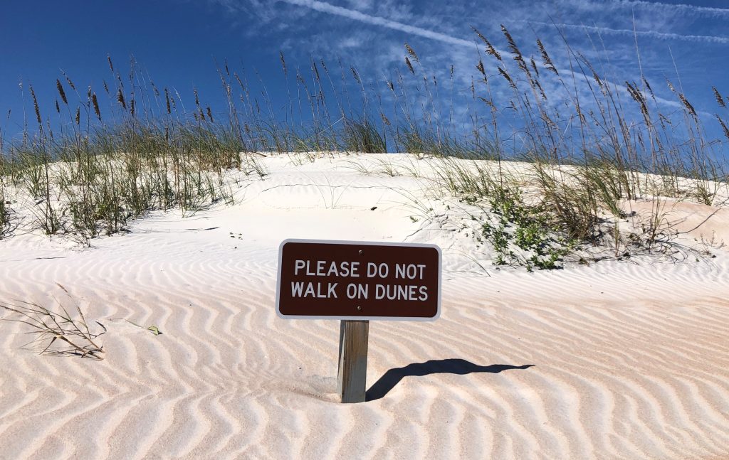 When visiting the beach, use designated walkways and walkovers. Do not walk on or through the dunes, which can damage the dunes and kill plants. Even if you don’t see plants on the dunes, please remain on the lower, flat portion of the beach and do not walk or play on or along the edge of the dunes, which can cause erosion.