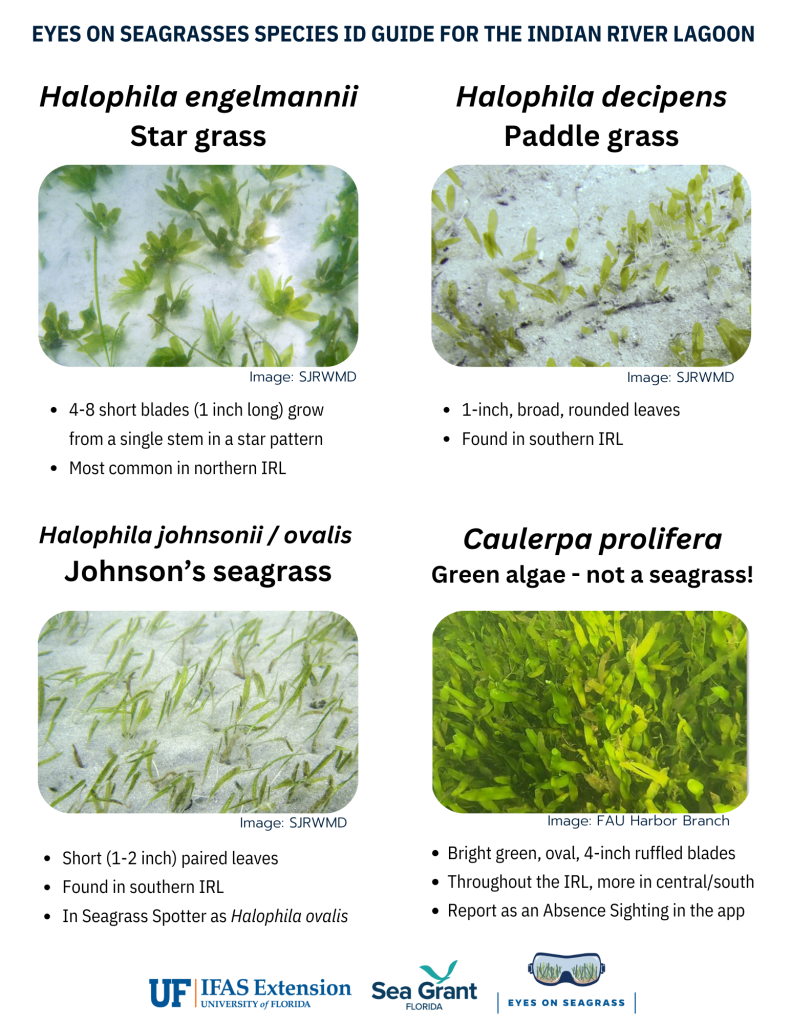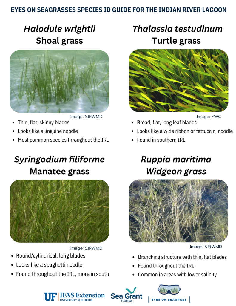 Keep reading below to learn more about the seagrasses in the Indian River Lagoon! If you would rather listen than read, please join us for an in-person presentation about the ecology of seagrass in the Indian River Lagoon and the Eyes on Seagrass Blitz at Marine Discovery Center in New Smyrna Beach at 10 am on Tuesday, May 6.
