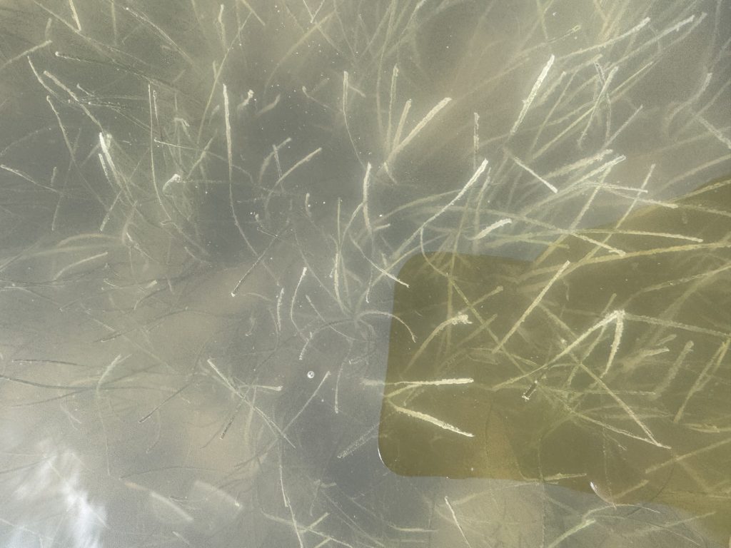 Macroalgae are important primary producers that are food for some organisms and take up nutrients in the environment as they grow. They can also provide habitat to small invertebrates and fish, and some attached species may be able to help with sediment stability. However, if there is too much macroalgae, it can also have a negative impact on the ecosystem. A large quantity of drift macroalgae may cover the seagrass bed and prevent it from getting sufficient sunlight to photosynthesize. There are also many types of smaller algae, including single-celled phytoplankton that float in the water and epiphytic algae that grows attached to the seagrass blade itself. These algae can grow rapidly if there are too many nutrients in the lagoon, which then prevents the seagrass from getting the sunlight they need to photosynthesize and survive. A healthy estuary will have some macroalgae, but in an estuary with poor water quality, we will see more algae than seagrass.