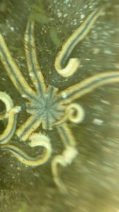 He encountered dozens of Nine-armed Sea Stars, normally common and healthy in these waters, showing signs of a fast-acting and fatal condition. The signs included curling limbs, dead tissue and, in many cases, bodies disintegrating into the sand.