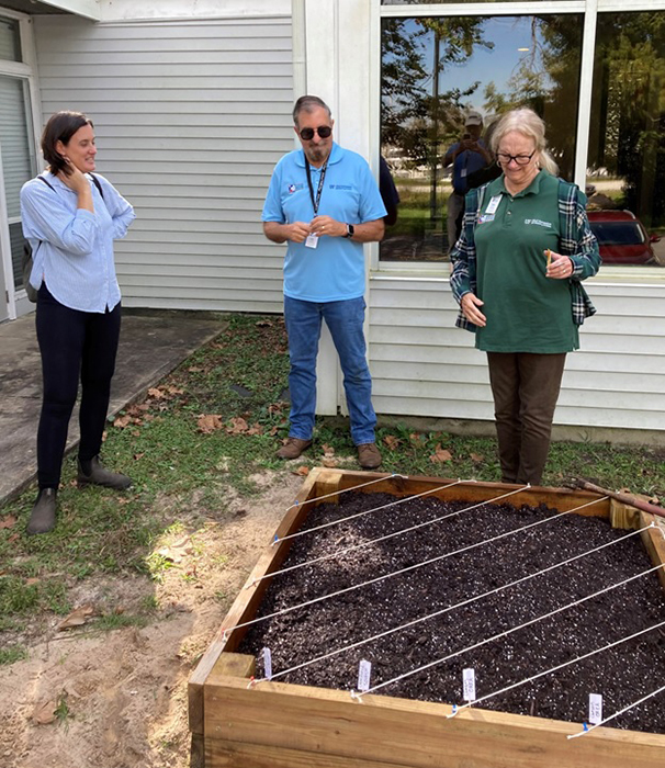 In October, Franklin County Master Gardeners Ted Ruffner and John Franklin installed two 4’ x 4’ garden beds using Ted’s portable nail gun and donated lumber. Next several MGVs gathered to line the beds with landscape fabric and unload 22 bags of SOIL that was donated by Mark Willis of Apalachicola (never say dirt! Oops! Dr. Pat Williams, the MGV Coordinator never allowed us to use the “D” word in class). MGVs Becky Comyns and Helen Golgowski joined in what turned into a celebration because the Franklin County MGV team got news that it had been awarded a state-wide Master Gardener Legacy Grant to further education in the county.