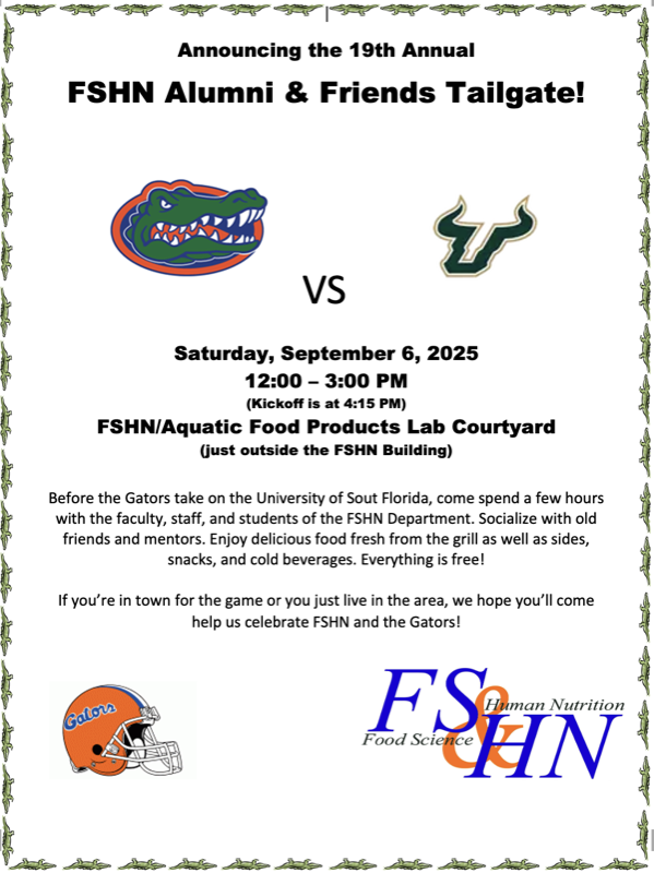 The annual FSHN Alumni and Friends Tailgate is almost here! On September 6 from 12pm to 3pm, join students, faculty, staff, and alumni in the FSHN/Aquatic Food Products Lab Courtyard, located outside the FSHN building. Bring your appetite: we have fresh food from the grill as well as sides, snacks, and cold beverages–and it’s all free! Kickoff for the highly anticipated game between the University of Florida and the University of South Florida is at 4:15pm, so get ready to cheer on the Gators!