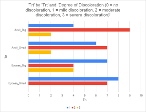 trimmed with the small bypass pruners, but the most stems with severe discoloration were found on the stems pruned using the big bypass pruners. There were more branches with moderate discoloration found on all branches pruned using anvil pruners with 16 branches showing moderate discoloration and 4 showing severe discoloration. In comparison, bypass pruners showed moderate discoloration on 11 branches. Despite a seeming trend toward more severe damage on branches pruned by anvil pruners, after running a quick test for significance, none was found (P-value of 0.44). It is important to emphasize that while the chart to the right might lend us to assume significance, none actually exists.