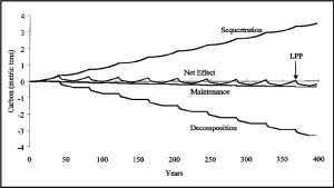 Figure 2 illustrates this relationship. Over the course of 400 years, successive generations of trees sequester carbon, steadily increasing the cumulative carbon stored over time (Sequestration). However, this is almost completely offset by the rising carbon released through decomposition (Decomposition). The Net Effect represents the carbon stored by living trees minus the emissions associated with ongoing maintenance (Maintenance). Eventually, maintenance-related emissions accumulate to the point where they surpass the carbon that can be stored by a tree at that site—this marks the Last Positive Point (LPP).
