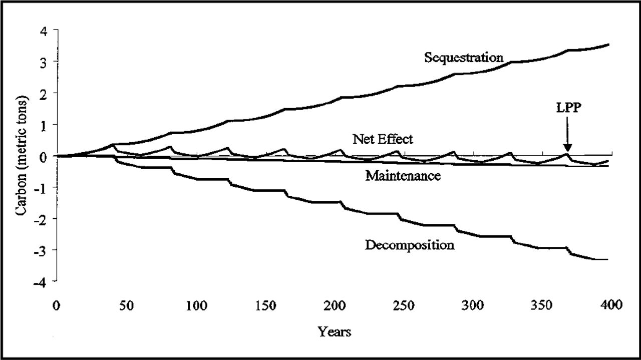 Figure 2 illustrates this relationship. Over the course of 400 years, successive generations of trees sequester carbon, steadily increasing the cumulative carbon stored over time (Sequestration). However, this is almost completely offset by the rising carbon released through decomposition (Decomposition). The Net Effect represents the carbon stored by living trees minus the emissions associated with ongoing maintenance (Maintenance). Eventually, maintenance-related emissions accumulate to the point where they surpass the carbon that can be stored by a tree at that site—this marks the Last Positive Point (LPP).