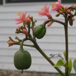 According to Marc Frank, Botonist, UF Herbarium, flower structure may provide clues as to pollination mechanism. Were the pink flowers pollinated by bees? Insects or wind? I am pleased to see many nickel sized fruit at the Bronson Discovery garden. Could these yield viable seed? Will they revert back to one of the parent plants?