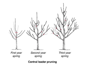 Similar to pruning peaches and nectarines, young apple and pear trees need to be trained to determine the form of the tree later in its life. Because these fruit trees have a more vertical growth form, they are pruned using a central leader system. Initial pruning selects a leader stem with three to six scaffold branches selected about 6 inches apart vertically and equally spaced around the trunk.