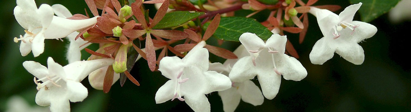 Glossy abelia is a fine-textured, semi-evergreen, sprawling shrub with 1.5-inch-long, red-tinged leaves arranged along thin, arching, multiple stems. It is a hybrid between A. chinensis and A. uniflora. It stands out from other ... READ MORE
