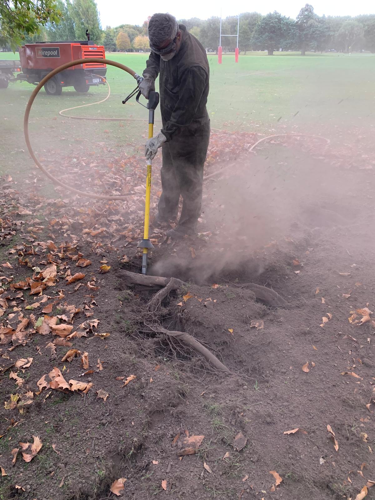 Figure 1. Justin Morgenroth, recipient of the 2025 L.C. Chadwick Award for Distinction in Arboricultural Research, demonstrating that he still gets behind the air excavator to conduct his research (Credit Andrew Benson).
