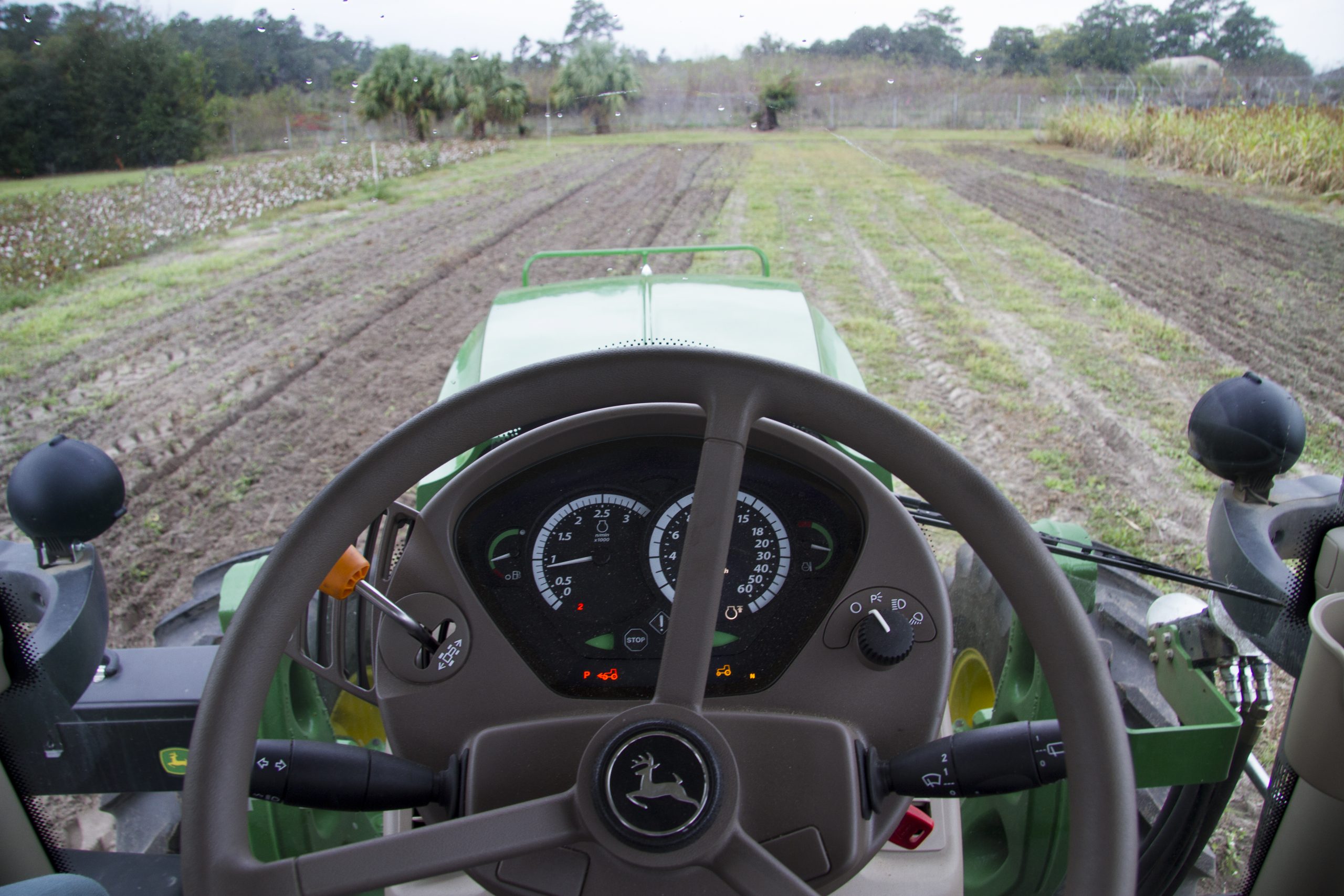 A view from a tractor interior as it plows a field at the University of Florida’s teaching farm.