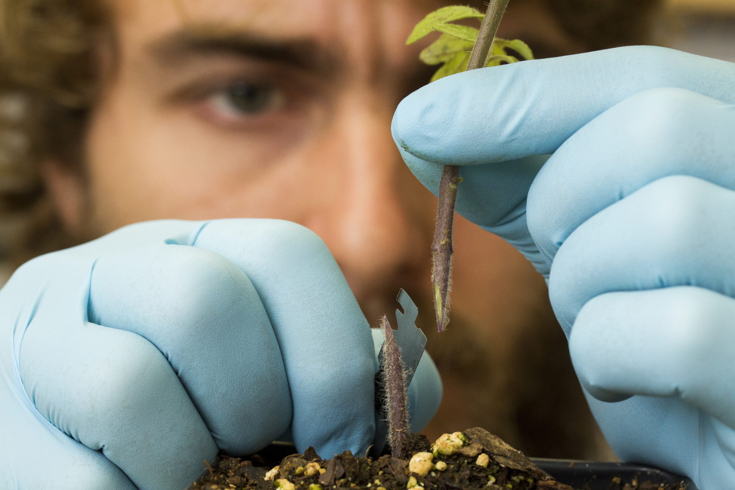 Zack Black, during his time as a horticulture sciences student, concentrates as he grafts two tomato plants together in Xin Zhao’s lab. Photographed for the 2015 Research Discoveries report.