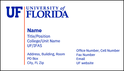 We standardize all UF/IFAS business cards to provide consistent institutional identity and to reduce design and printing costs. UF business cards are intended to identify the bearer regarding their relationship with the university and should only be used for official UF business purposes. Business cards should identify the bearer concerning their official position at the university.