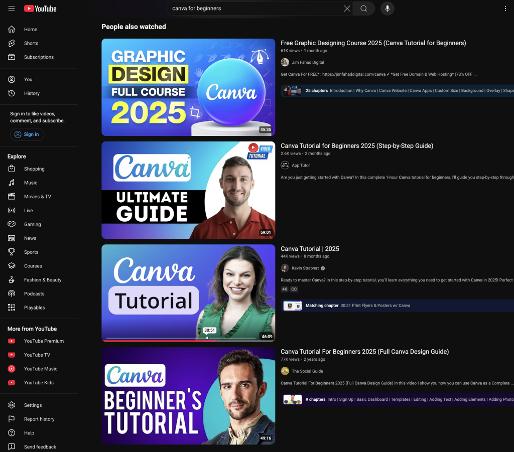YouTube has thousands of free video tutorials available, ranging from quick tips to in-depth walkthroughs on creating specific types of designs. Many content creators break down complex features into easy-to-follow steps, making it ideal for visual learners. Plus, you can find tutorials tailored to your own skill level without needing a subscription. You can visit the official Canva Youtube page at youtube.com/@canva, or use the search term “Canva” to see other content creators.