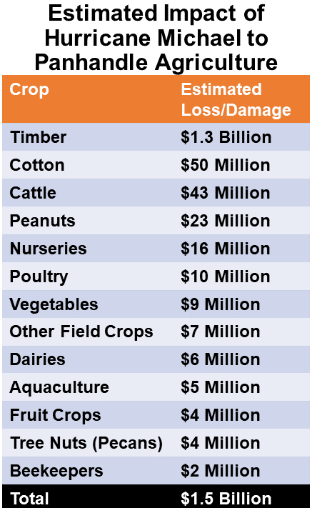 The Florida Department of Agriculture and Consumer Services (FDACS), UF/IFAS Food and Resource Economics Department, Florida Forest Service, and the National Agriculture Statistics Service, and Dr. Sergio Alvarez, University of Central Florida compiled a summary of estimated damages and loses to farms and ranches in the Florida Panhandle due to Hurricane Micheal.