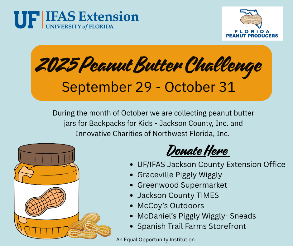 Start Giving Season early this year by participating in UF/IFAS Extension’s Peanut Butter Challenge this October. Jackson County is participating again this year.