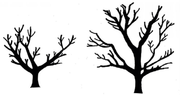 An illustration of the pruning structures. On the left is the open center training system and the right is modified central leader. Photo rights: http://gardeningsolutions.ifas.ufl.edu/care/pruning/pruning-deciduous-fruit-trees.html