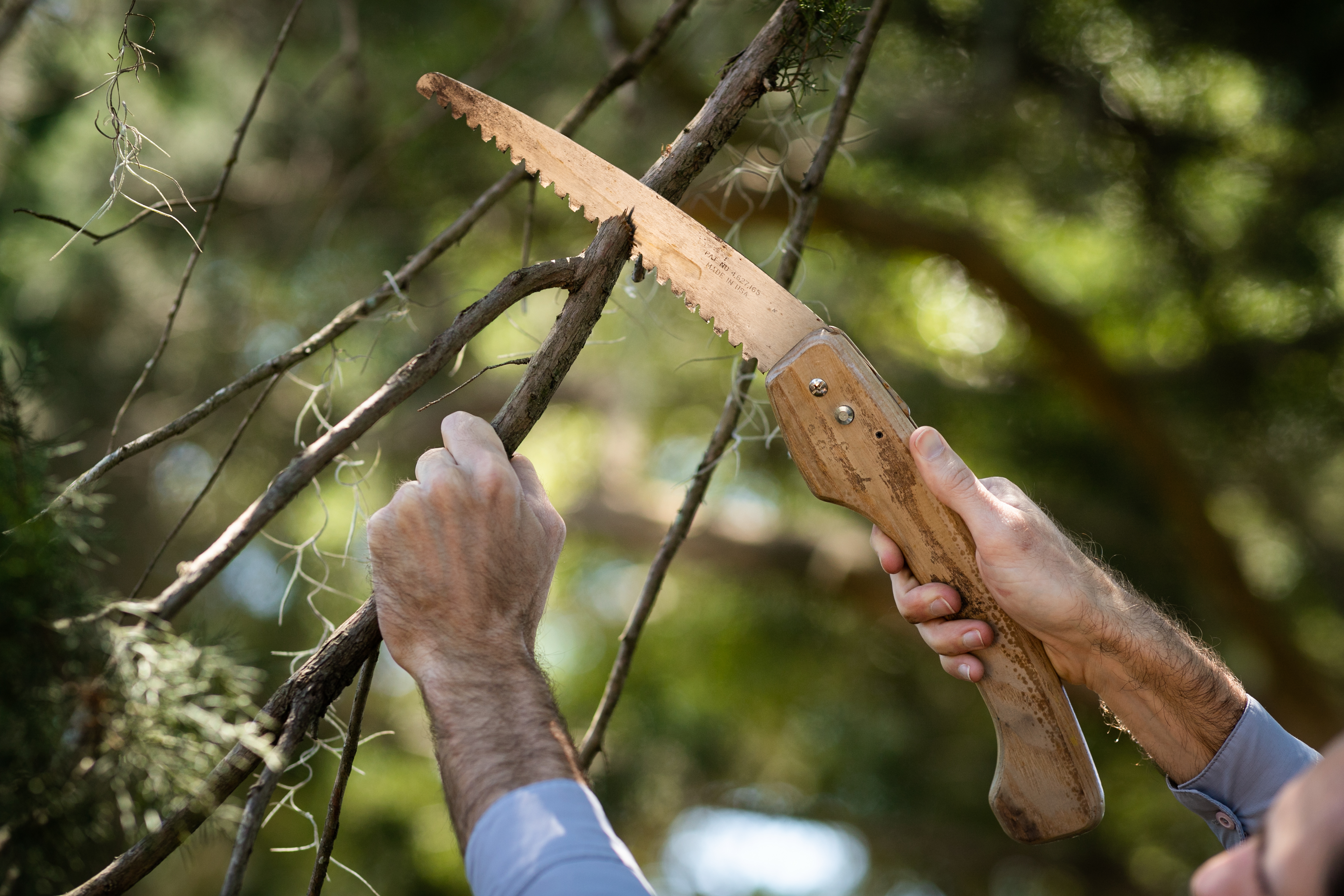 Hand saw cutting a tree branch. Photo taken 05-01-20.