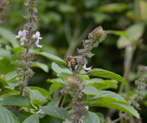 African blue basil attracts honey bees by the droves. Photo by Beth Bolles, UF IFAS Extension Escambia County. - Don’t use pesticides or greatly limit their use. Choose soaps and oils as they do not have a long residual, but even use these when bees are not actively foraging. If any spraying needs to take place, do so early in the morning or late in the evening. Avoid using dust formulations of pesticides as they can easily be picked up on the hairy bodies of bees.
