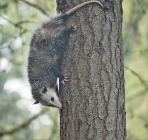 Opossums have several unique physiological traits that support their survival. Most famously, they can “play dead” or enter a catatonic state when threatened, a behavior known as thanatosis. When they are in this state their eye glazed and tongues loll, and the opossum emits the foul scent of death from its anal glands that discourages predators. It is important to note that this is not a conscious act, but rather thanatosis is an involuntary response to extreme fear and an evolutionary strategy that has saved many a possum life. In short, the possum does not fight or flight but rather fools an attacker.