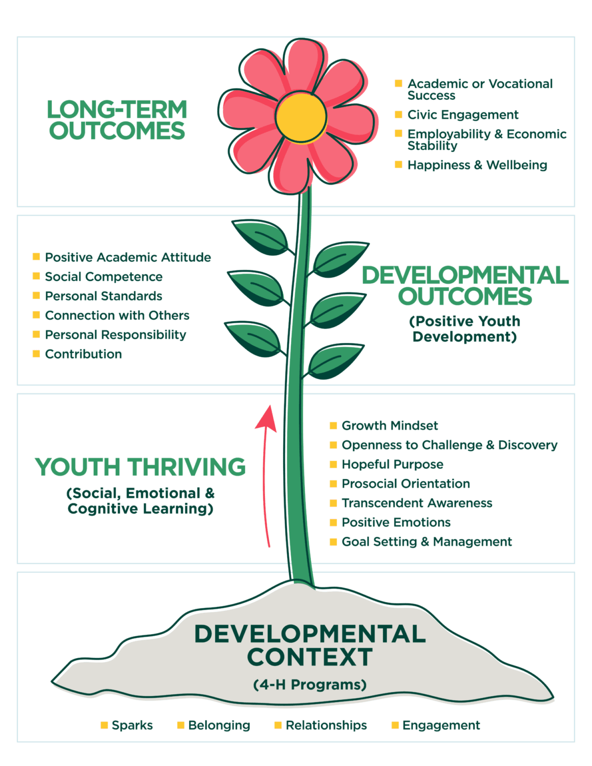 Just as plants need sunlight, water, and rich soil to grow, young people thrive when they’re rooted in the right environment. That kind of intentional, nurturing support is at the heart of 4-H. We use a research-based approach that helps adults create spaces where kids feel safe, supported, and motivated to grow. 4-H’s success is rooted in the science of Positive Youth Development, which focuses on supporting young people’s growth through meaningful learning experiences. This approach aims to equip youth with essential life skills and a strong sense of empowerment, helping them achieve their full potential.