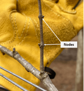 - Fruit develops on current year’s growth. Locate the nodes. The node is a slightly swollen portion of the cane. We shorten canes to keep the vine productive and manageable. Make a cut just above second or third node.