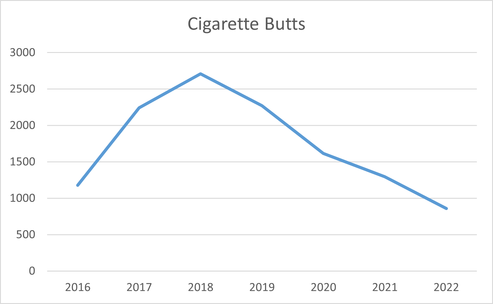 Cigarette butts, the number one global item several years running, appear to be on the general decline in Cedar Key. Perhaps this is due to overall rates of smoking decline. Or perhaps this is related to local efforts related to health and wellness such as the Cedar Key’s Students Working Against Tobacco (SWAT) team.