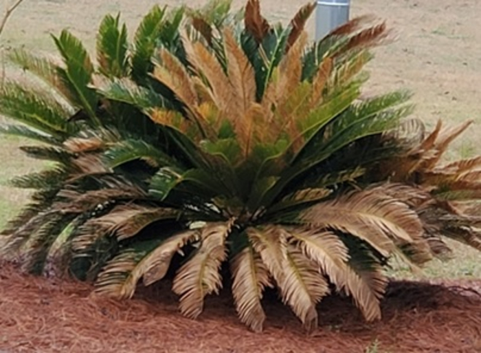 Sago Palm (Cycas revoluta) is a common landscaping plant in our area and I have several in my yard. They are not actually palms, but members of the ancient Cycad (Cycadaceae) family. Their official USDA hardiness zones are 9 and 10 while here in Wakulla and Leon County we are in zone 8, a little colder than what this plant can tolerate.
