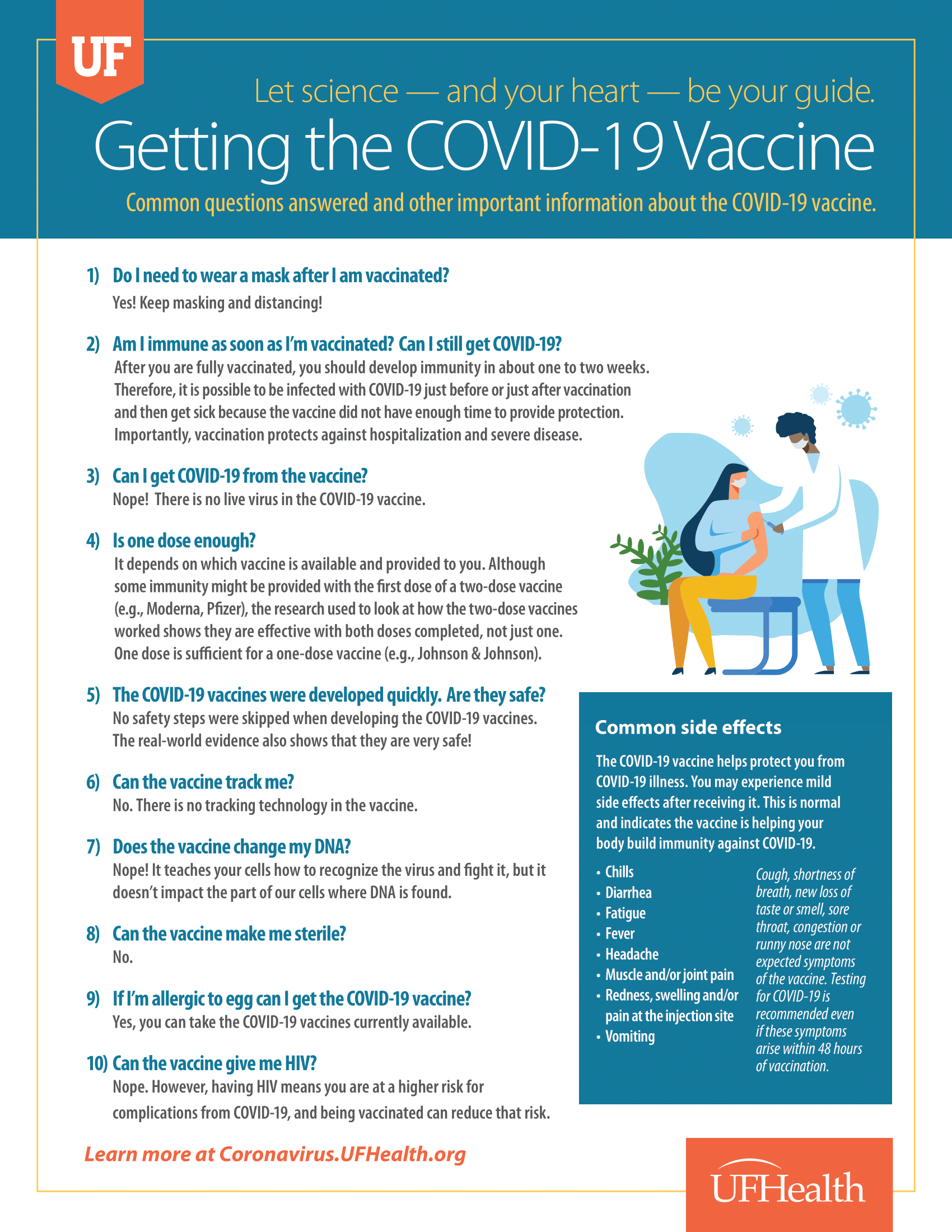 COVID-19 Vaccine FAQs: Answers from UFHealth Email0Facebook0Twitter0Reddit0X Linkedin0 Stumbleupon0 Download To download a PDF of this fact sheet, click here. 0