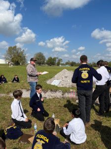 Alec Hoffner, Senior Scientist with Kimley-Horn and Associates, an alumnus of the Manatee County Land Judging contest served as Chief Judge. Manatee River Soil and Water Conservation District Supervisor Julie Tillett attended as did Dan West, Jimmy Keen, and Holly Keen. Manatee County Land Judging Alumni representative Dan West assisted with presenting the medals. The Callon Keen Sr. award was presented by Keen family members Jimmy and Holly Keen. Lunch was sponsored by Brett Reeder and Bart Hoopingarner representing UPL and Gowan, respectively. Manatee County Cattlemen’s Association provided tables and chairs. The Mosaic Company sponsored a tent and portable restrooms. Staff from Manatee County Extension Service, Sarasota County Extension Service, and USDA Natural Resources Conservation Service were instrumental in conducting a successful contest. After the contest, Chief Judge Hoffner reviewed the results with the students.