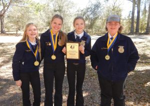 A team from Parrish Community High School – John Keen, Makayla Chenard, Kaycee Kirby, and George Chenard, advised by Susan Grainger – won the Callon Keen Sr. Award, sponsored by the Keen family, for the highest scoring team overall. They also placed first in the FFA high school division.