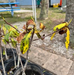 Recommendations for Mangrove Management: You can protect your mangroves by ensuring that they are managed appropriately to encourage health. Follow all applicable rules and regulations, while limiting any trimming during times of drought or immediately before tropical storms. Pay attention to pruning dose and timing, trimming in fall and winter months can be more stressful. Never remove a significant amount of foliage from mangroves that are exhibiting other stress symptoms such as slow/stunted growth, leaf yellowing or general lack of vigor. If you are planting new mangroves along your coastlines, be sure to inspect the young plants from the nursery closely for any of the indicative symptoms of CNP such as leaf yellowing, thickening, spots, or necrotic tissue on leaves and stems.