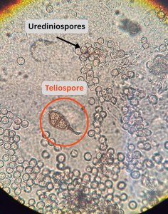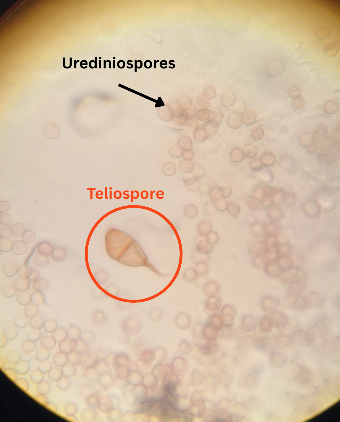 In this example, I found two spore types on the porterweed: the larger teliospores and the smaller urediniospores. Both can go on to infect new porterweed plants — but remember, rusts are highly specialized and don’t typically jump to unrelated plant species.