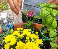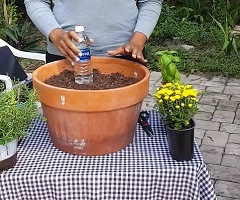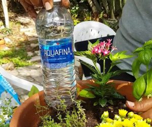 Water your container garden to fully saturate the all of the soil in the pot. Then you may put one or two of your drip bottles in as an easy low maintenance fix to providing adequate water to your plants as they are established and grow through the season.