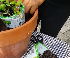 Assemble your materials: soil, water, plants, scissors, and a positive attitude. Start with an almost full pot of soil to nest your plants in.