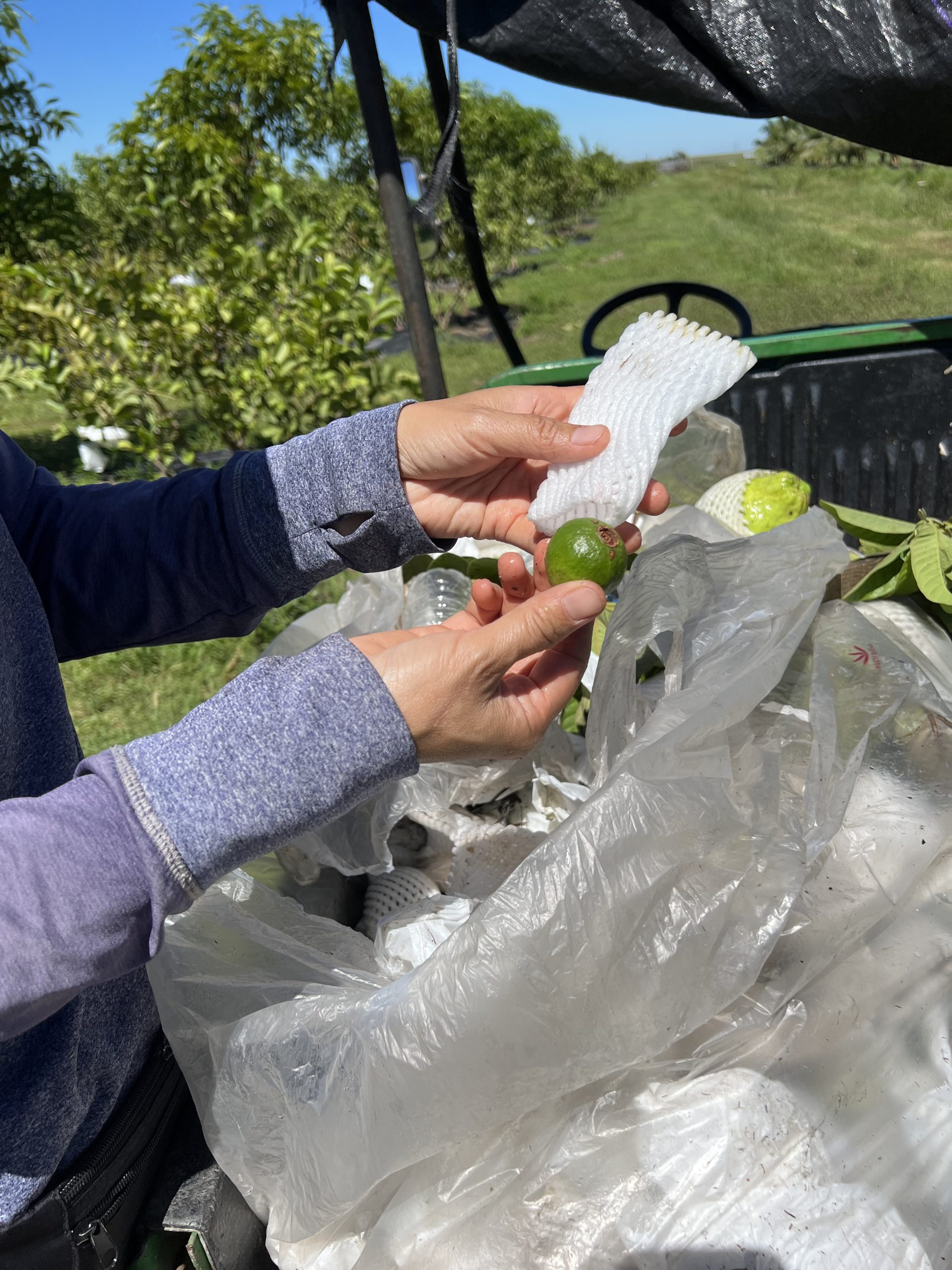Crops that were producing fruit and flowers at the time of the storm will have reduced yields. Many fruits fell, and those that remained on the trees were often damaged by the winds. In this picture, a grower shows one of the fallen guava fruits she has gathered since the storm. Guava are wrapped in protective covers while still on the tree, to protect the developing fruits. Other fruiting trees, like mango and sugar apple, were in their flowering stage. Flowers lost due to wind damage will also result in decreased fruit yields.