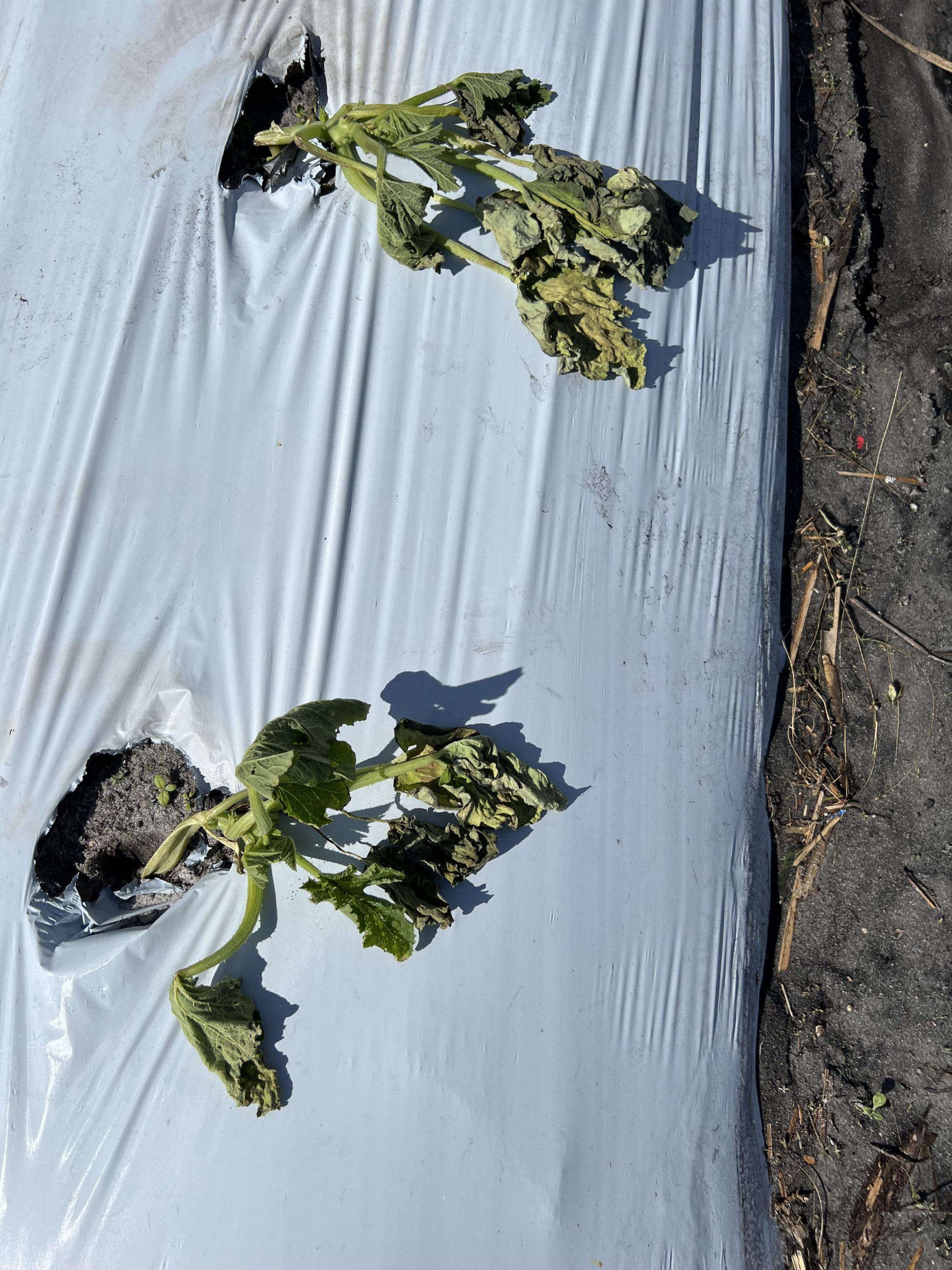 Nursery plantings are typically underlaid by ground cloths. Shown here, some of the ground cloth was ripped up by strong winds.