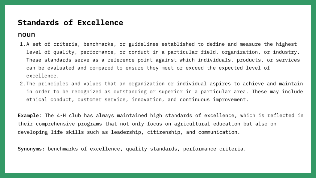 In the world of 4-H, the ‘Standards of Excellence’ is more than just a fancy term. It is a process designed to measure the engagement and achievements of our members and clubs. Think of it as a roadmap that not only sets clear expectations for everyone involved in 4-H but also guides us on how to reach and surpass those expectations. And the cherry on top? It’s a way for our members and clubs to get well-deserved recognition and scholarships to attend 4-H events. In this blog, we’ll dive deep into the nitty-gritty of the 4-H Standards of Excellence, shedding light on its significance, the goals it sets for 4-H members, and how to conquer them.