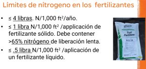 Fertilizacion: Al año se deben aplicar de 2-4 lbs. de nitrógeno por 1,000 pies cuadrados. En cada aplicación solo se puede aplicar 1 lb. de nitrógeno por 1,000 pies cuadrados. Esa es la catidad máxima que el césped puede absorber sin causar contaminación ambiental. Los meses para fertilizar, siguiendo la ordenanza del condado Miami-Dade con un fertilizante de fórmula completa y con un 65% de liberación lenta de nitrógeno pueden ser Noviembre, Febrero y primera quincena de Mayo. Y en Julio y Septiembre con un fertilizante que contenga potasio y mágnesio (no nitrógeno ni fósforo ya que pueden causar contaminación).