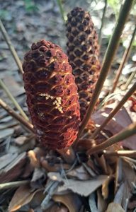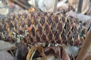 It is during these lean times that I notice the Atalas laying eggs on the coontie seed pods. This past winter, I witnessed some of the eggs on the pods develop into caterpillars. I do not know how far along they got as they either moved away from that spot or perished. I find this Atala behavior, to borrow a football expression, as their Hail Mary pass. A last-ditch effort to foster the next generation.