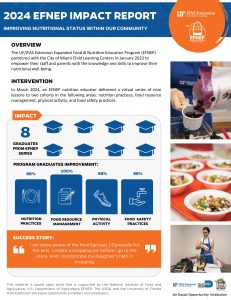 Our commitment to intergenerational education deepened significantly upon discovering UF/IFAS Extension’s Expanded Food & Family Nutrition Program (EFNEP). EFNEP provides essential knowledge and practical guidance to parents on incorporating fresh, healthy foods into their daily meals, emphasizing skills such as effective food budget management, nutritious meal preparation, and overall health enhancement. EFNEP educators, who are integral members of their communities, play a vital role in delivering these impactful lessons. In 2023, EFNEP provided nine lessons on nutrition, food resource management, physical activity, and food safety to four parents and staff. All participants improved their overall nutrition, and 75% saw gains in food resource management, physical activity, and food safety. In 2024, the program’s reach expanded to eight graduates. This year, 100% of participants showed improvement in food resource management, and 88% experienced progress in nutrition, physical activity, and food safety practices