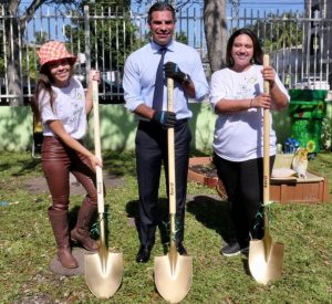 Photo: Mayor Francis X. Suarez with Master Gardener Volunteers, Susana Peñaranda and Yaredly Hernández Robles, at Eaton Park Child Learning Center, celebrating the impact of the Ready, Set, Grow! Initiative.